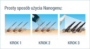 Umyj i wysusz włosy. Ułóż dowolną fryzurę, a następnie posyp nanowłóknami miejsca z przerzedzonymi włosami. Pogładź dłońmi posypane Nanogenem włosy. Zobaczysz jak prześwity skóry głowy znikają, a fryzura staje się gęsta i naturalna. Po nałożeniu kosmetyku zalecamy spryskanie włosów lakierem Nanogen Locking Spray, aby jeszcze mocniej związać nanowłókna z włosami. Zastosowanie lakieru nie jest konieczne, ale dodaje dodatkowego komfortu. Lakier Nanogen Locking Spray ma silne właściwości wodoodporne.