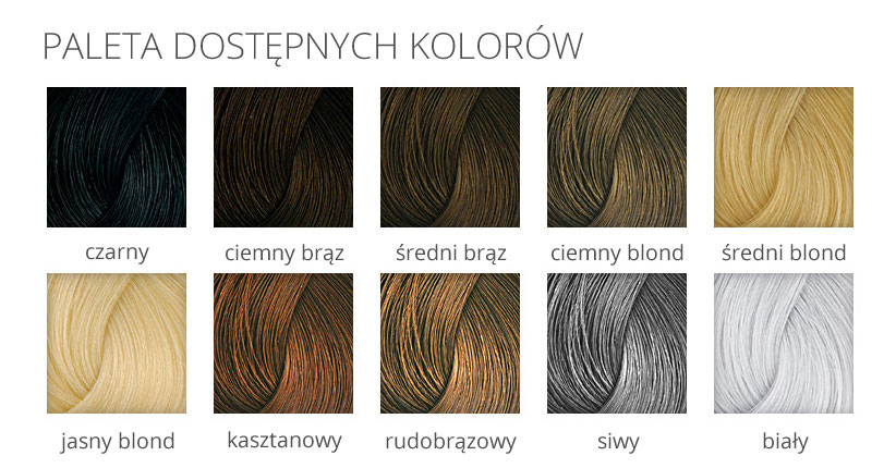 Nanogen dostępny jest w 10 naturalnie wyglądających odcieniach. Można je ze sobą łączyć aby uzyskać optymalny efekt. Jeśli włosy siwieją, najpierw należy zastosować kolor siwy, a następnie kolor właściwy dla włosów. Kolor nanowłókien nie musi być identyczny z kolorem włosów. Jeśli Nanogen jest ciemniejszy od włosów, delikatnie je przyciemni, jeśli jest jaśniejszy, delikatnie je rozjaśni. Zalecamy stosowanie raczej ciemniejszych kolorów niż za jasnych.